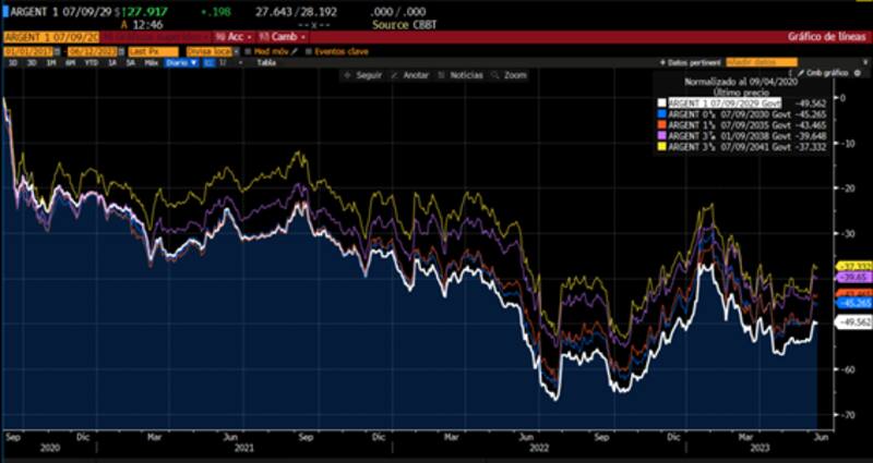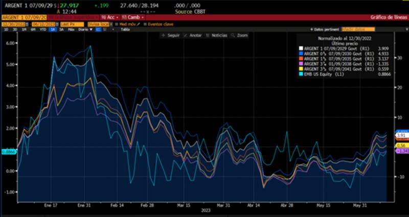 En el acumulado del año, la deuda argentina opera con bajas de hasta 1,3% y avances de hasta 5%. En esa misma línea, emergentes sube 0,9% en 2023.