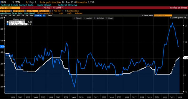 "Por primera vez desde que la Fed inició el proceso contractivo, la inflación general ahora navega por debajo de la tasa de política monetaria. Esto implica que la Fed ya no la corre de atrás. La Fed quiere la inflación baje más (en especial, la núcleo), pero no tiene apuro por romper nada, por lo cual la hipótesis de una pausa fue cobrando mayor relevancia", afirmó.