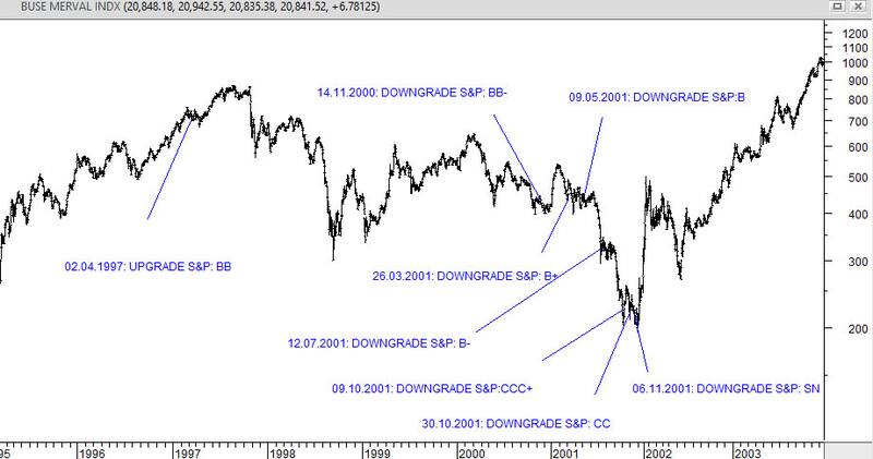 En el trayecto bajista de 2008 las calificadoras vuelven a degradar la nota de Argentina y muy cerca del piso bajaron la calificación de la deuda local en B-, una noticia que representó una histórica oportunidad de compra nuevamente. En septiembre de 2010 las calificadoras vuelven a elevar la nota argentina y a comienzos de 2011 nuevamente el Merval alcanza un techo para perder cerca de un 45% de su valor en pesos. El piso de dicho ajuste fue alcanzado con la degradación de deuda en octubre de 2012.