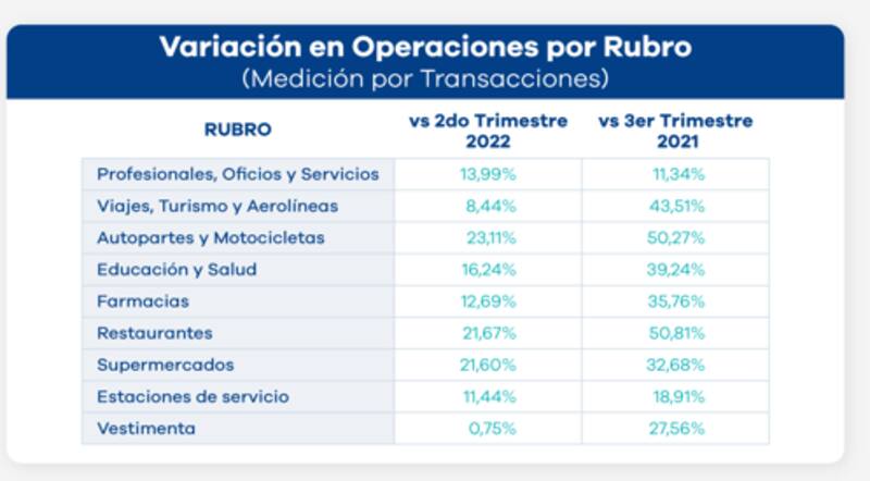 El informe indicó que las operaciones con tarjetas en restaurantes crecieron 50,81% en el 3° trimestre del año respecto de igual período del año pasado y 21,67% respecto del trimestre anterior, y las transacciones en autopartes y motocicletas se incrementaron 50,27% interanual y 23,11% frente al trimestre anterior.