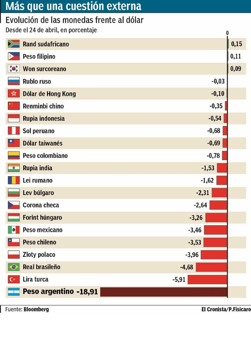 Detrás del peso varios escalones atrás se ubican la lira turca, con un descenso de 5,9%, y el real brasileño, con una caída de 4,7%. A su vez, las monedas polaca, chilena, mexicana y húngara, bajaron entre 4% y 3,3%. En cambio, el rand sudafricano, el peso filipino y el won surcoreano, ya lograron recuperarse. No obstante, si bien se trata de una comparación de Bloomberg, en la plaza porteña aclararon que, justamente, estas monedas que rebotaron, no deberían tomarse como emergentes sino como divisas de países en desarrollo.