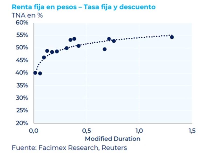 Actualmente la curva a tasa fija opera con tasas del 40% (TNA) en el extremo más corto, saltando a niveles de entre 45% y 55% en el tramo medio y largo.