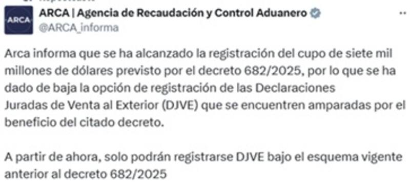 Sin embargo, ayer por la tarde Arca informó que se ha alcanzado la registración del cupo de u$s 7000 millones previsto por el decreto 682/2025.