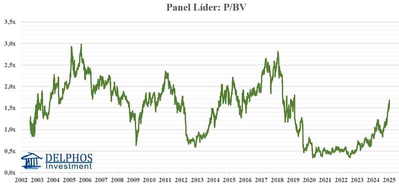 El rally que inició en 2023 mostró primero una clara formación de piso en la zona de 0,5x P/VL, para en dos años saltar hasta los niveles actuales cercanos a 2x.