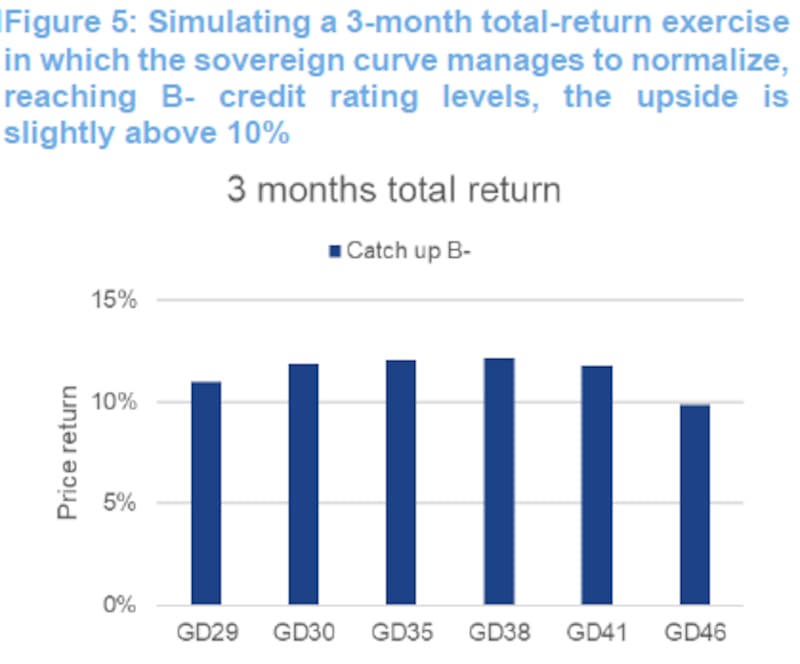 Si se simula un ejercicio de retorno total de tres meses en el que la curva soberana logra normalizarse y alcanza niveles de calificación crediticia B-, el alza es levemente superior al 10%, mientras que en el mismo ejercicio para los Bopreal manteniendo el spread (GD30-BPOC7) el alza es del 9%.