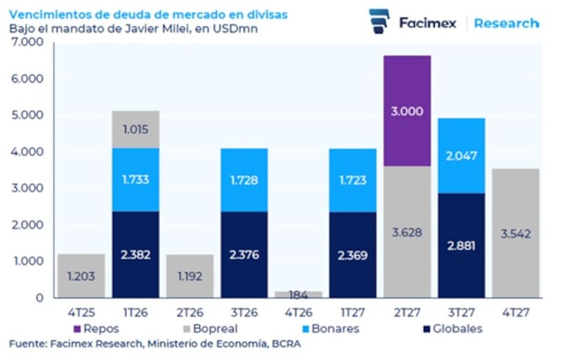 Según los analistas de Facimex Valores, un eventual swap de u$s 20.000 millones cubriría los vencimientos hasta abril de 2027 inclusive, lo que, junto al financiamiento ya obtenido del FMI, permitiría cubrir la totalidad de los vencimientos hasta fin de 2027.