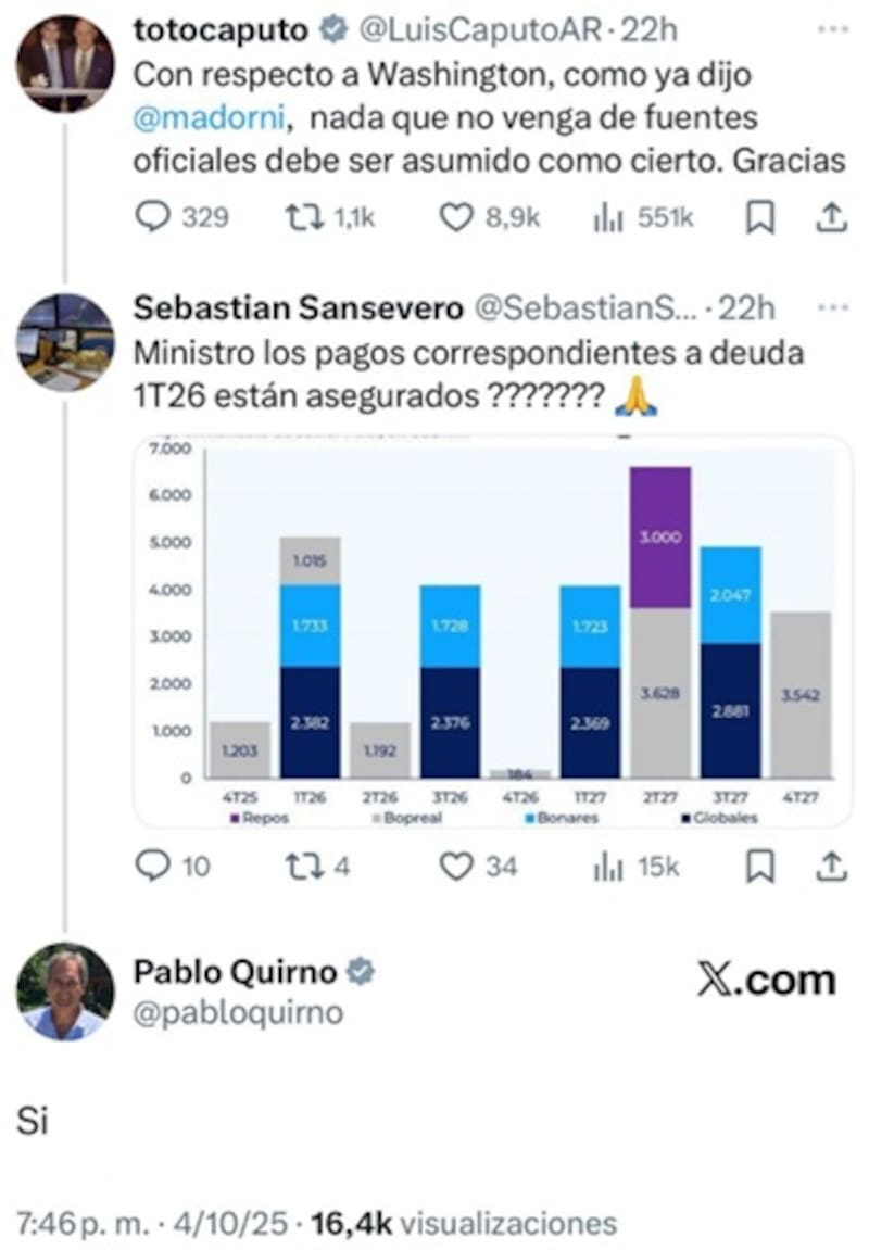 Si bien Caputo no respondió, quien sí dio una respuesta fue el secretario de finanzas, Pablo Quirno, asegurando que los pagos están asegurados.