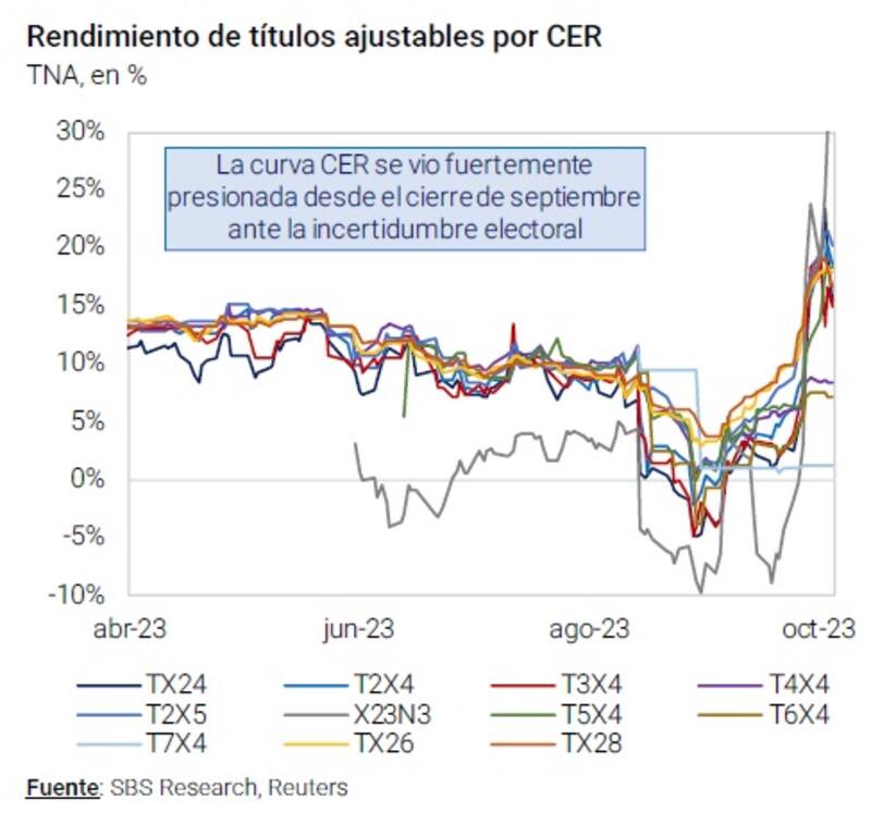 "Con relación a toda la deuda en pesos, creemos que se mantendrá performing pese al stress reciente dada la proporción de tenedores públicos (65%) y privados (35%). Este pondría valor a papeles como TX24. Pensando también en el pass-through a precios que se daría de iniciar a acomodar tanto del tipo de cambio real como precios relativos, creemos que hay valor en papeles CER con vencimiento en el segundo semestre de 2024, que capturarían mejor ese escenario", sostuvo Franco.