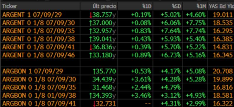 En cuanto a los instrumentos emitidos bajo legislación argentina, la principal suba la ostentó el AL30, que avanzó 3,61% y logró perforar el 20% de tasa interna de retorno, al ubicarse en 19,9%. También tuvieron alzas interesantes el AE38 (+3,46%) y el AL35 (2,44 por ciento).