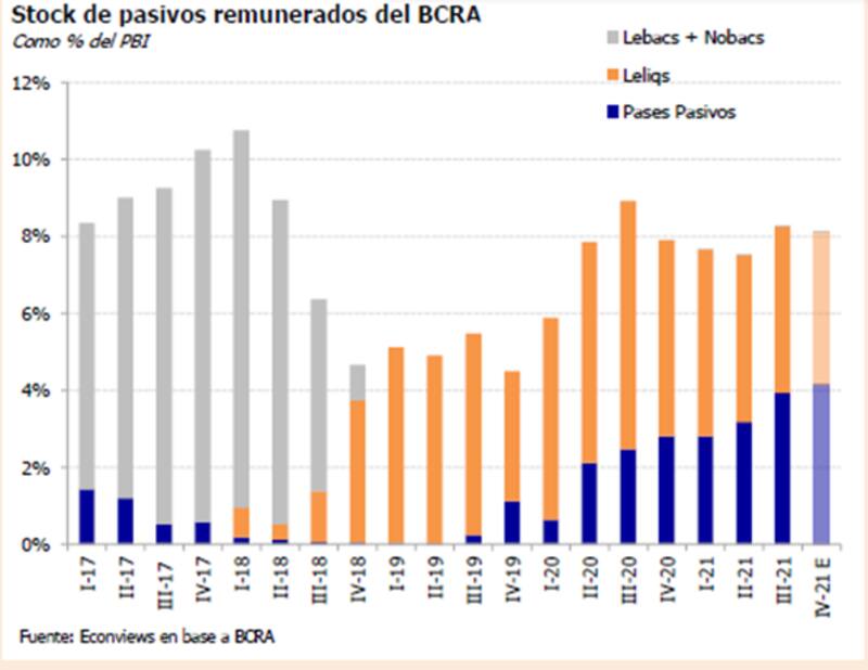 Según datos de Econviews, el stock de pasivos remunerados, incluyendo Leliqs y Pases pasivos, cerraría el ultimo trimestre del año en torno al 8% del PBI.
