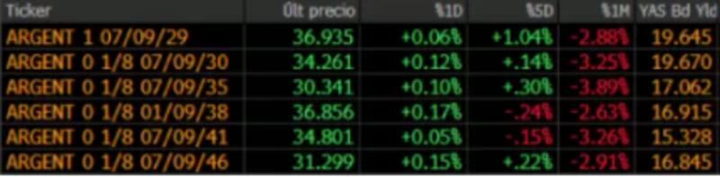 En los últimos 30 días, todos los tramos de la curva argentina operan con pérdidas. Los bonos a 2029 y 2030 registran bajas en el último mes del 2,9% y 3,25% respectivamente. Por su parte, los Globales 2035 y 2038 caen 3,9% y 2,6% mientras que los bonos más largos también retroceden 3,3% y 2,9% para los vencimientos a 2041 y 2046.