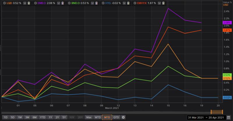En lo que va del mes, la deuda de mercados emergentes subió 2,08%, similar a la deuda emergente de alto rendimiento que rebotó 1,9%.