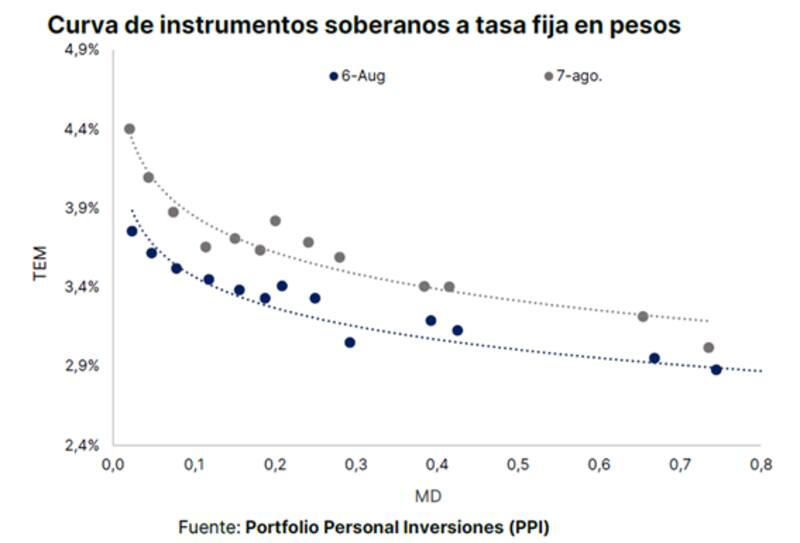 Esto son niveles de tasa por encima de los que se veían a mitad de la semana pasada, cuando la curva se ubicaba en 3,9% en el tramo más inmediato, y con tasas de 3,4% a 3% en los plazos medios y largos.
