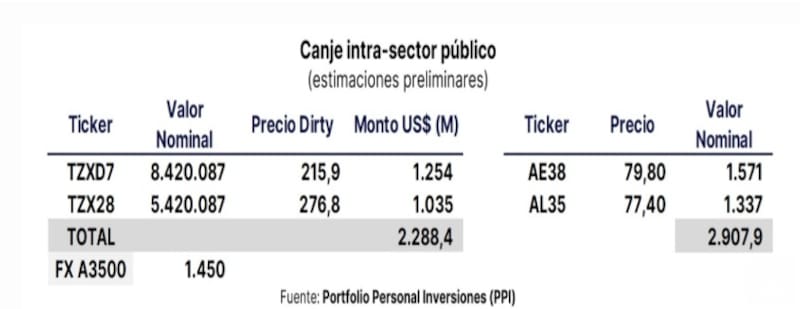 Para Portfolio Personal Inversiones (PPI), el canje publicado también daba pistas de la concreción de un Repo. “De acuerdo con nuestras estimaciones, el tamaño del canje luce consistente para cubrir el pago de enero, especialmente si se tiene en cuenta que los depósitos del Tesoro en dólares ascienden a US$1.900 millones", plantearon en un informe este martes.