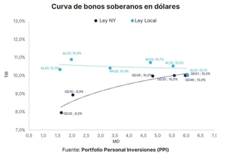 “En este contexto, vemos más valor en el tramo largo de la curva de dólares, como el GD35 que tiene mayor retorno potencial en caso de una compresión del riesgo país, por su mayor duration. De hecho, estos últimos días después del anuncio, los bonos más largos estuvieron bastante más firmes que los cortos y este comportamiento debería continuar”, sostuvo Casabal.
