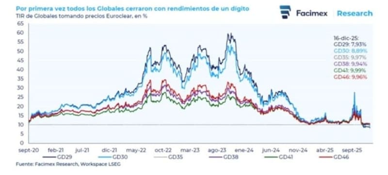 “Junto con las reformas estructurales en curso, estas medidas deberían impulsar una mayor compresión del riesgo soberano, actualmente en 559 puntos básicos. En un escenario a tres meses en el que la curva soberana se normaliza a una calificación crediticia B- (con rendimientos cercanos al 8%), los bonos GD35 y GD41 ofrecen el mayor potencial de crecimiento, en torno al 12%”, detallaron desde Research Mariva.