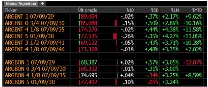 En la jornada, los bonos no muestran grandes cambios, aunque las ultimas medidas del Gobierno apuntan a bajar los riesgos de incumplimiento de la deuda en dólares y garantizar los próximos pagos.