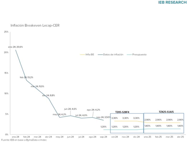"Parece prudente combinar Lecap cortas como la Lecap del 31 de octubre (S31O4) y la Lecap del 29 de noviembre (S29N4), que son menos vulnerables a un repricing del sendero de inflación, con el Boncer de febrero de 2025 (T2X5)", detalló.