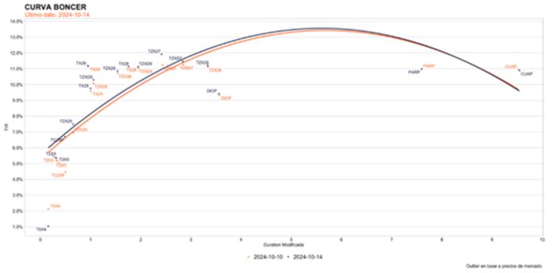 "La decisión del Tesoro de forzar una pendiente positiva en el tramo largo de la curva, con tasas de corte superiores al resto de la curva. Esto sugiere que el Tesoro no está convalidando un escenario de desinflación y menor nominalidad como anticipa el mercado. Además, el dato de inflación del jueves (3,5% mensual) tuvo un impacto positivo, generando retornos mayores al 2% en la parte larga de la curva, lo que llevó a una compresión de los rendimientos y un aumento de las tasas reales (Boncer)", explicaron.