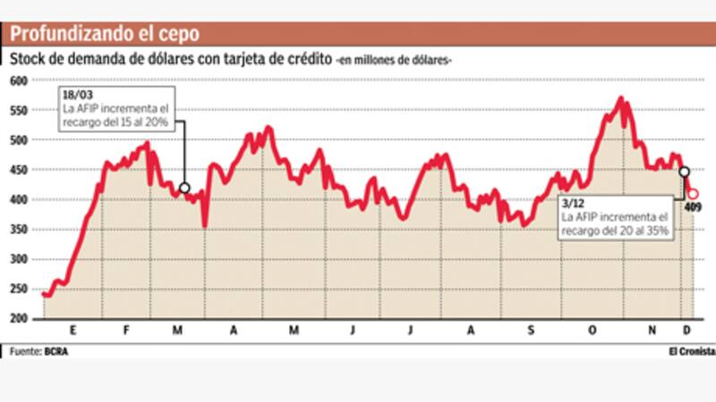 Dicen que nadie se baja de los viajes antes de tiempo. El nuevo recargo que sumó la AFIP a cuenta de Ganancias y Bienes Personales parece haber tenido un efecto inmediato en los consumos que realizaron los argentinos en el exterior con tarjeta de crédito. En la primera semana de diciembre (los días iniciales en los que se aplicó el recargo y la última que ha medido el Banco Central) la demanda de dólares por parte de los bancos para cubrir esos gastos tuvo una caída del 12%. Así, el promedio para los primeros 5 días pasó de u$s 483 millones en noviembre, a u$s 428 millones en diciembre. La caída, borra de una sola vez el avance que había experimentado la demanda de dólares para estas líneas de crédito en los últimos dos meses y podría ser la antesala de una caída aún mayor. En rigor, los u$s 409 millones que registró el Banco Central de stock de consumos con tarjeta el último día de la primera semana de diciembre arrojaría una caída del 15%. De extenderse el efecto torniquete, el Banco Central podría ahorrarse sólo en diciembre una cifra que superaría los u$ 100 millones y que anualizada podría ir arriba de los u$s 1.000 millones.