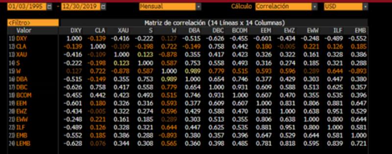 Tomando una correlación de largo plazo entre el dólar índex y las materias primas, se suele ver que la misma es negativa, es decir, cuando sube el dólar, caen las materias primas. El índice de agricultura y de materias primas tienen una correlación fuertemente negativa con el dólar.