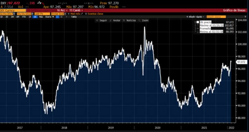 Gloria Patrón Costas, analistas de Portfolio Personal Inversiones (PPI), comentó que debido a un mundo volátil y de mayor aversión al riesgo dada la expectativa de una Fed más hawkish en este 2022 viene impulsando la cotización del dólar índex y que la suba del mismo presiona sobre el tipo de cambio local.