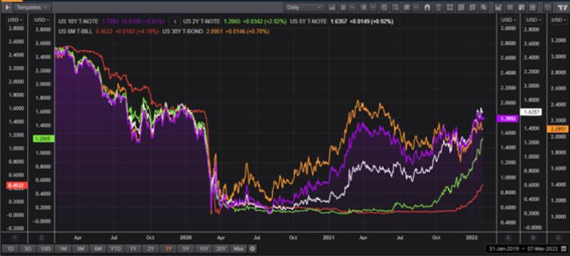 Las tasas cortas suelen ser más sensibles a la suba de tasas de la Fed y por ello es que se ve que los rendimientos a 6 meses y 2 años han mostrado una suba mucho mas fuerte que las tasas a 10 y 30 años.