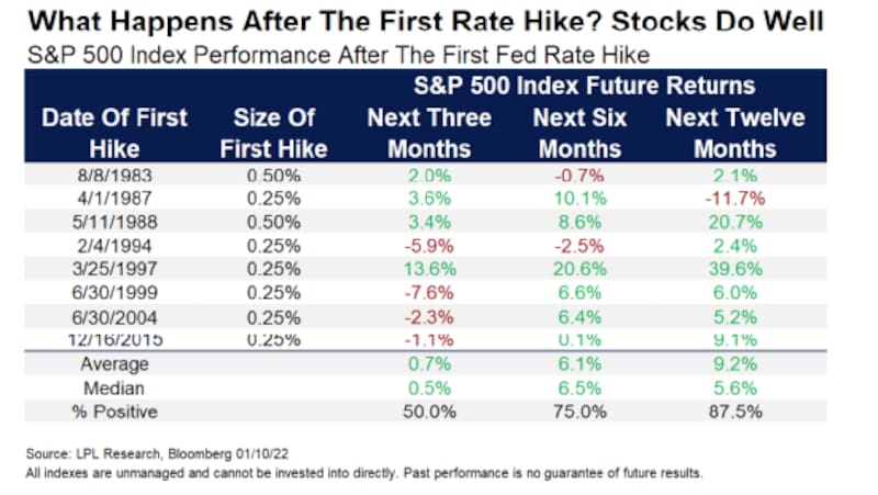 "Los inversores deben recordar que las subidas de tipos de la Fed suelen ocurrir cerca de la mitad del ciclo económico, con potencialmente años restantes de ganancias en las acciones y la economía", explicó el estratega jefe de mercado financiero de LPL, Ryan Detrick.