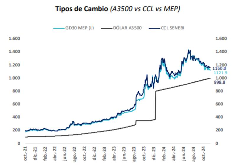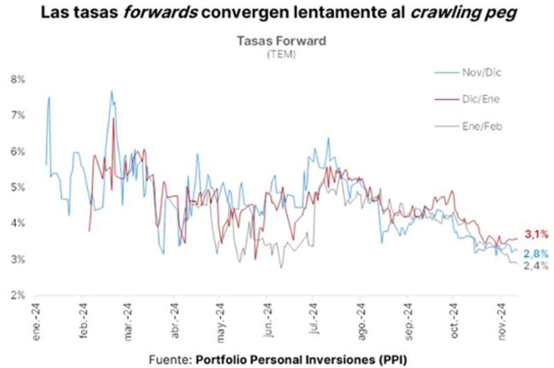 A modo de referencia, a mediados de septiembre, las forwards de octubre/noviembre y de enero/febrero oscilaban entre 3,5% y 3,7% mensual, a la vez que se especulaba incluso con una aceleración del crawling peg transitorio en diciembre, cuando las tasas forward se ubicaban en noviembre/diciembre en 4,2%.