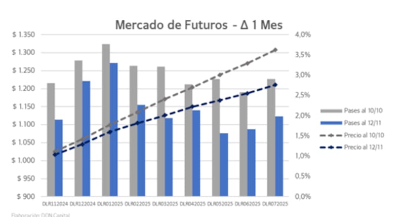 En esa línea, agregaron que "el mercado la comenzó a ver, con el ritmo devaluatorio, ya que cuando observamos los niveles de pases de los contratos de dólar futuro, hay varios contratos que ya se ubican por debajo de la línea del 2%, en línea con el discurso del Gobierno, que planea reducir el ajuste del crawling según lo proyectado en el Presupuesto 2025".