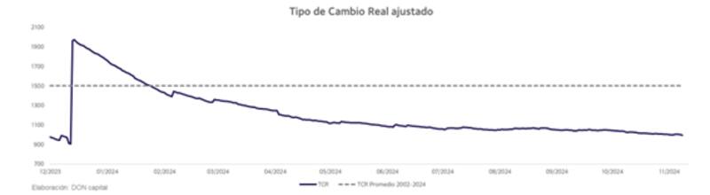 El tipo de cambio real (TCR) continúa su apreciación, habiendo perdido el 97% de la mejora cambiaria del 13 de diciembre y situándose alrededor del 34% por debajo de los niveles históricos.