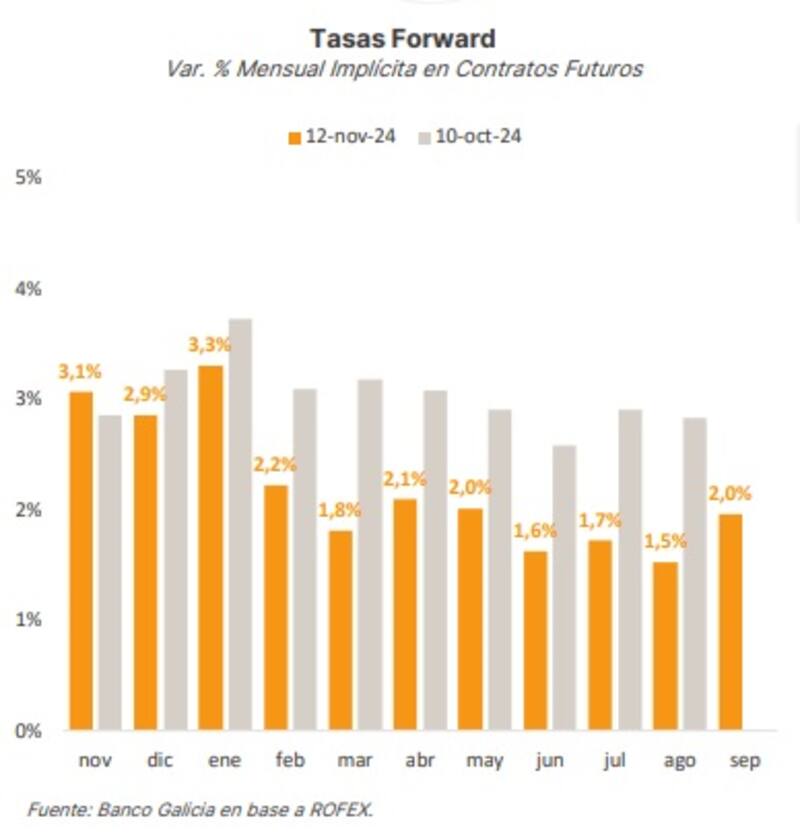 Hoy las tasas de devaluación implícita en Rofex esperadas para noviembre son del 3,1%, bajando al 2,9% en diciembre y ubicándose en 3,3% en enero.