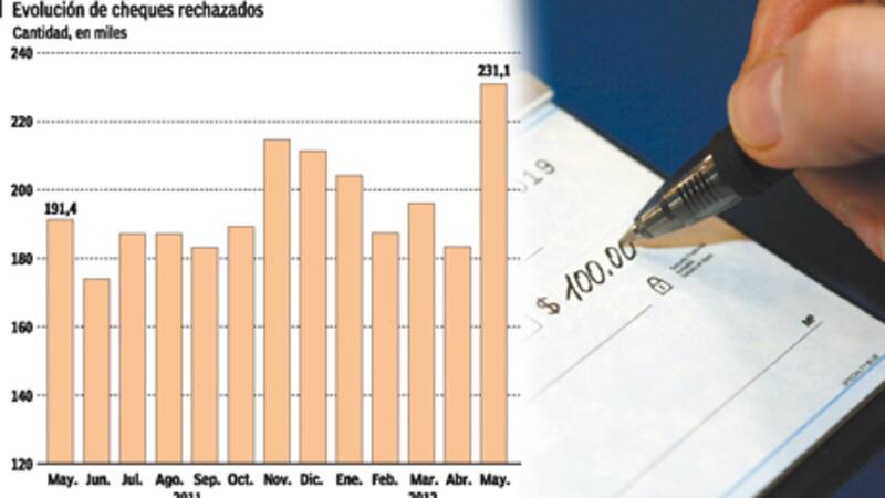 Es que, de acuerdo a cifras publicadas por el Banco Central de mayo pasado (último mes disponible), la cantidad de cheques rechazados ascendió a 231.113. Es una cifra récord que no se veía desde diciembre de 2007, y representa un incremento del 20% con especto a mayo del 2011. Si se divide la cifra por los 22 días hábiles del mes, da 10.505 cheques diarios sin fondos. Si se lo divide por las cinco horas en que funcionan los bancos, da 2.101 por hora, lo que equivale a 35 por minuto, o a un valor rechazado cada dos segundos.