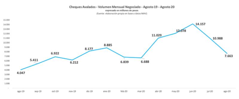 En agosto el descuento de cheques avalados registró la suma de $7.663 millones y de esta manera, dicho volumen cayó un 45% respecto de los niveles que se registraba en junio y 30% respecto de julio. Así, de esta manera, el volumen se ubica debajo de los valores de comienzo de año. Sin embargo, con estos registros en los primeros 9 meses del año más de $78.000 millones en cheques de pago diferido fueron avalados por SGR, un 91% por encima de los niveles de 2019, a la misma altura del año.