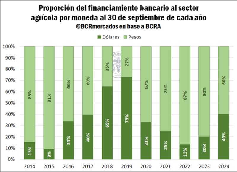 "En términos porcentuales, los préstamos en moneda extranjera al sector agrícola durante el período de enero a septiembre de 2024 alcanzaron el 40% del total, la mayor proporción en cinco años, evidenciando un importante avance desde el 13% que se registraba en el mismo período de 2022. La participación del financiamiento bancario en dólares muestra este año un crecimiento tanto en términos absolutos como relativos", explicaron en el informe los analistas Belén Maldonado y Julio Calzada.