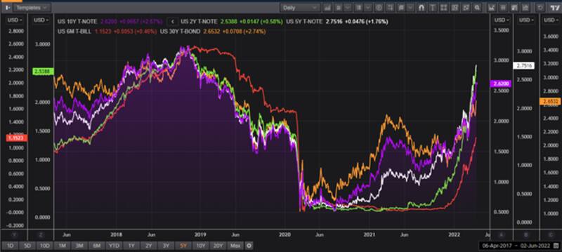 Los rendimientos a 2 años se ubican en 2,53% y a 5 años en 2,75%, mientras que los rendimientos a 10 años y 30 años se encuentran en 2,63%, lo cual deja una curva invertida.