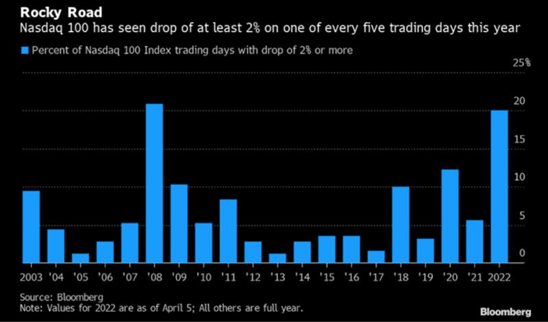 El índice Nasdaq 100 cayó un 2,2 % el martes, la decimotercera vez que cae al menos un 2 % este año. Eso significa que el índice tecnológico ha promediado una caída del 2% o más una vez cada cinco días de negociación.