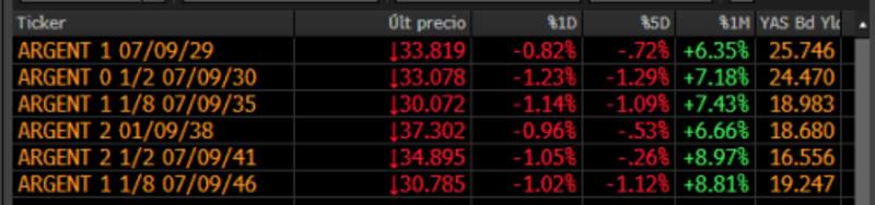 La deuda argentina acompaña el mal clima global y también cae. Todos los tramos soberanos argentinos operan en rojo el miércoles, con el Global 2029 perdiendo 0,8% y el Global 2030 retrocediendo 1,2%.