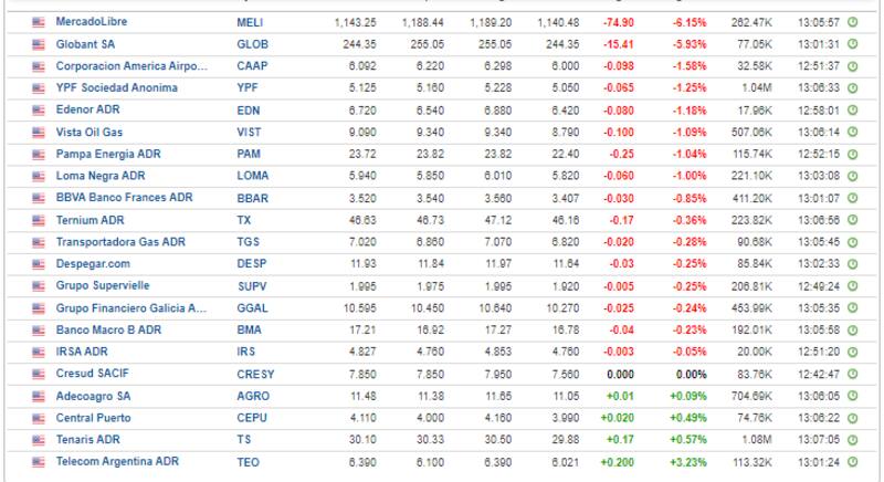 Las acciones tambien operan a la baja. Las debilidades son lideradas por MercadoLibre y Globant que caen 6,1% y 5,9% respectivamente.