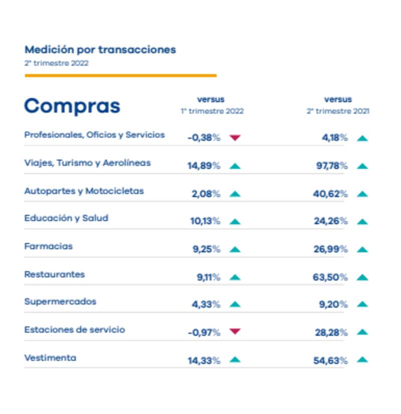 "En el segundo trimestre del año, los rubros con mayor crecimiento interanual en transacciones con tarjetas de crédito, débito y prepagas fueron Viajes, Turismo y Aerolíneas con 48%, Restaurantes 63% y Vestimenta con un 54%", destacó Ballarino.