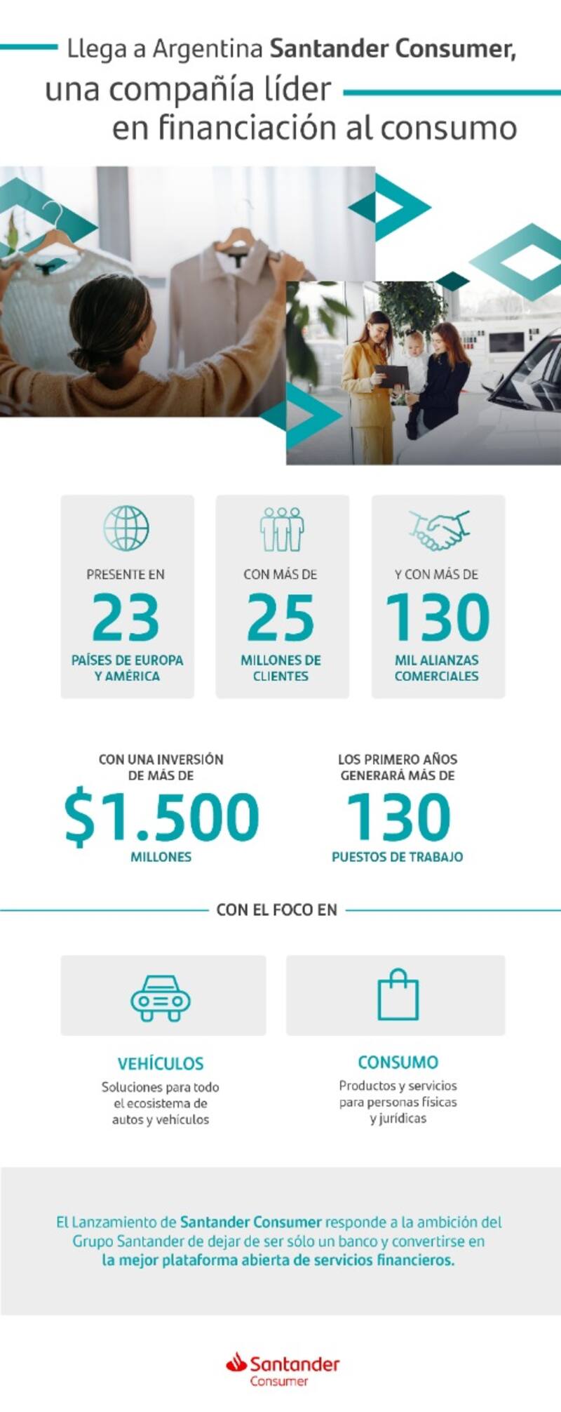 Banco Santander anunció que comenzará a operar en la Argentina Santander Consumers, líder de crédito al consumo en Europa y en la región sudamericana, con préstamos a empresas, pymes, personales y, fundamentalmente, con amplia experiencia en el financiamiento de compra de automóviles.