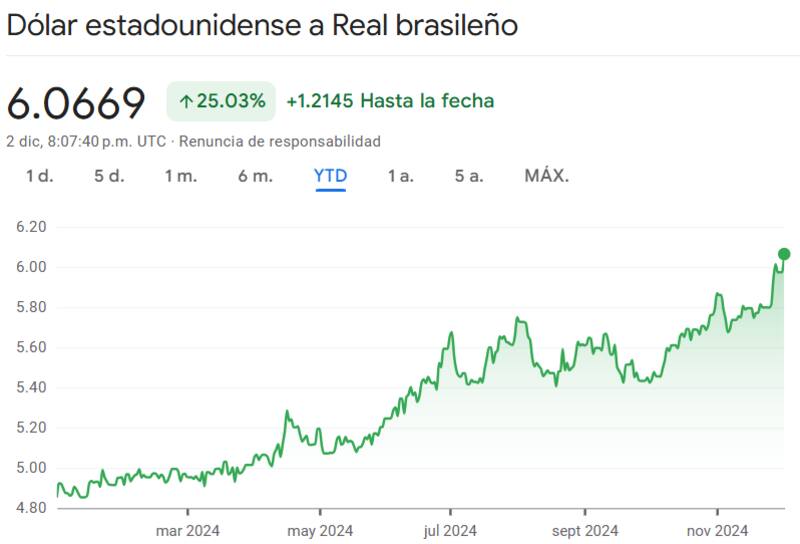 La depreciación del real lo llevó a ubicarse este lunes arriba de 6 unidades por dólar. Los ruidos internos por el gasto público y expectativas de mayor inflación, sumado a la fortaleza global del dólar tras el triunfo de Donald Trump hicieron que la moneda estadounidense en Brasil trepara casi 4% en noviembre y 25% en lo que va del año.