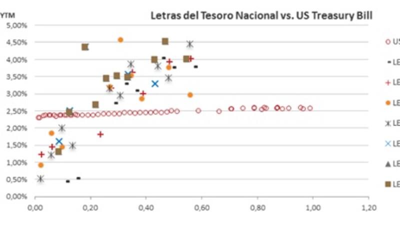 Según un análisis elaborado por Sergio Maugeri, porfolio Manager Senior de ICBC Investments, las letras emitidas por el tesoro nacional cotizan con un spread negativo comparadas con los US Treasury Bill. Es decir, las letras del tesoro argentino rinden menos de lo que rinde un bono del tesoro americano.