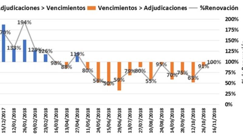 “Vemos que la mejora en los porcentajes de renovación va acompañada de bajas sucesivas en la tasa de colocación, que pasó de un 7% de tasa de corte en la licitación del 12 de septiembre a un 4.75% en la última. Esta es una señal más que importante si tenemos en cuenta que en el programa financiero se proyecta refinanciar en 2018 50% de las Letes en dólares en manos de privados y en 2019 del orden del 60% de las Letes tanto en dólares como en pesos en manos de privados , sostuvo.