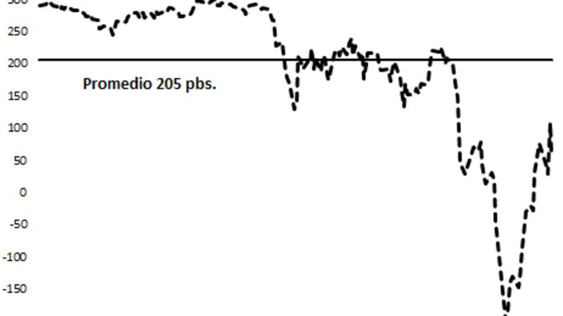 Bajo situación de normalidad, la curva de rendimientos debería mostrar pendiente positiva, esto es, bonos más largos rindiendo más que los cortos asociados al mayor riesgo temporal.