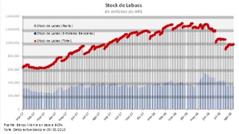 Los analistas de Banco Mariva señalan que el stock actual de Lebac alcanza a $ 976.000 millones, con datos actualizados al 09 de agosto pasado, ubicándose prácticamente en los mismos niveles, en términos nominales, de hace un año atrás, pero reflejando una notable caída tanto en la medición en dólares (-40% a/a), como en porcentaje del PBI (de 9,0% en ago-17 a 7,0% en la actualidad).