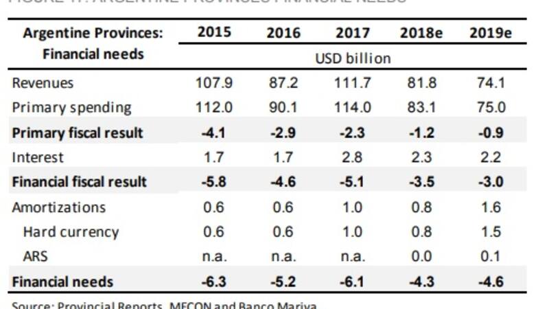 El equipo de research de Banco Mariva destacó en un informe que las necesidades financieras para el año próximo para las provincias son menores que las de años anteriores debido a la reducción del déficit fiscal primario provincial. De todos modos, dichas necesidades serían ligeramente más altas de las que cerrarían en 2018 debido a mayores pagos de amortización de deuda.
