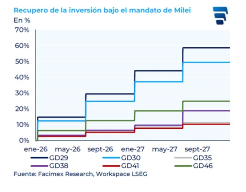 En cambio, los bonos más largos tienen un recupero menor hasta 2027. El Global 2046 recupera el 25% del total invertido hasta 2027, y del 20% en el Global 2038. Finalmente, el Global 2035 y el Global 2041 recuperan en 10% del total invertido hasta fin de 2027.