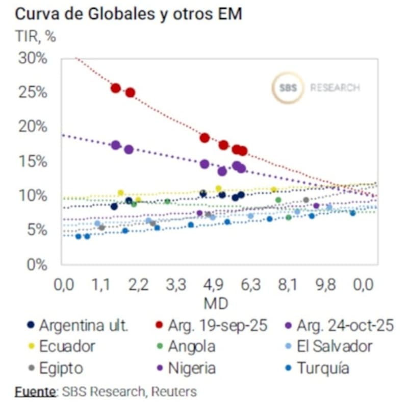 Hoy la curva de Argentina se encuentra por encima de otros créditos similares como el de Turquía, Egipto, Nigeria, Angola, El Salvador, entre otros.