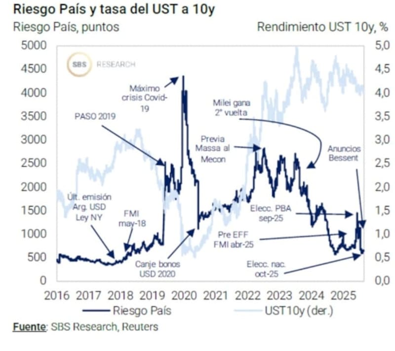 “En conjunto, estos factores abrirían espacio para que el riesgo país avance en un proceso de compresión y recorte parte del spread que mantiene frente a la deuda emergente comparable, acercándose a los diferenciales que veíamos a principios de año. Si este reacomodamiento se sostiene, la prima soberana podría comprimir hacia niveles por debajo de los 500 pb hacia el primer trimestre de 2026, un nivel más consistente con la posibilidad de que Argentina vuelva a colocar deuda en los mercados internacionales”, detallaron.